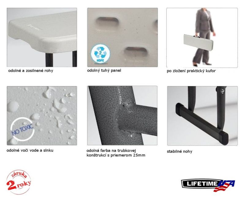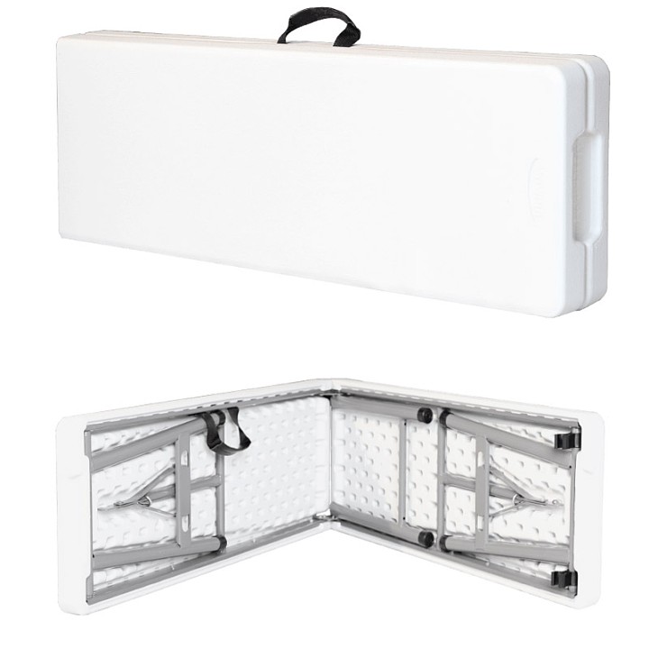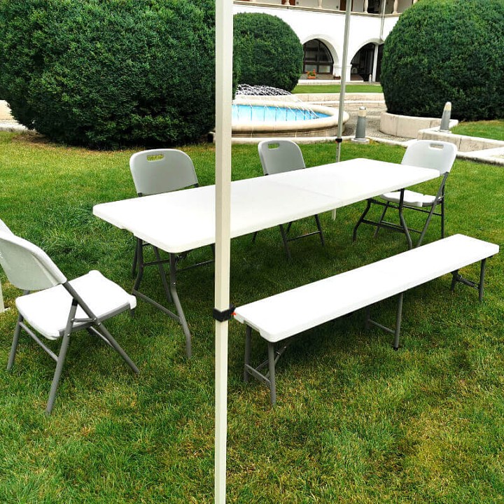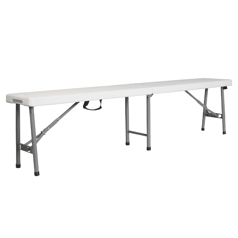 Los bancos plegables están hechos de una estructura de acero y polietileno (HDPE) muy resistente a la radiación UV. Los bancos son resistentes a las condiciones climáticas. El plástico no cambia de color ni de durabilidad bajo la influencia del sol. El banco se puede plegar fácilmente por la mitad y transportar como una maleta. El plástico es fácil de limpiar gracias al tratamiento antideslizante. Para 4 personas.